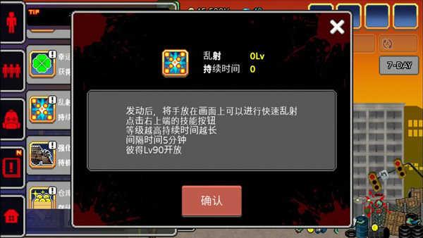 使用后一段时间内将手指放在屏幕上,主角会进行快速乱射,间隔时间五分钟,升级可以提升乱射的持续时间。解锁等级九十级。