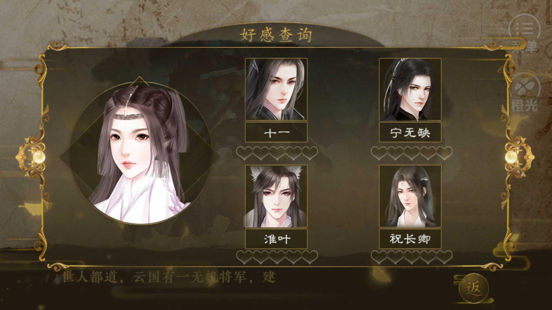 第一遍按照推荐走出了十一HE结局。一开始最喜欢的是十一的立绘(我还因为这张立绘入了另一个坑),忠犬人设很暖很有安全感,却在故事的发展中喜欢上了小王爷宁无缺。实在是喜欢这个设定,年幼时与女主是欢喜冤家,那一纸婚约,却在女主“死”后成为了枷锁。他努力的收集起她的所有,并用玩世不恭将深情隐藏。于是呢,出于喜爱,为了不遗漏剧情,我又完完整整走了一遍小王爷线。说到这里,忍不住表白一下:我喜欢你,很喜欢,我的宁无缺。顺便剧透一下,无缺线吻戏最多。嘴硬的死傲娇,就得要女主这种“话不多说就是上”的性子来治,看的过瘾。看到封面中的情节,无缺还不知道楚昭与望舒是同一人,而剧情进展到“我是在意那一纸婚约,我喜欢过去的望舒,我也喜欢现在的楚昭”,他在我心中是完美的,那种完完整整被喜欢的感觉。