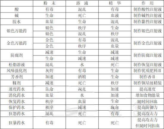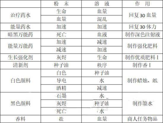 原料有八种常规类型:加速、减速、血量、有毒、秩序、混乱、生命、死亡,它们各自有对应的颜色