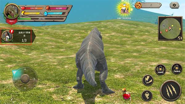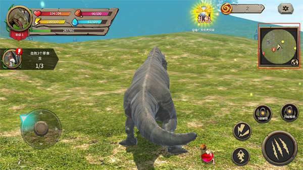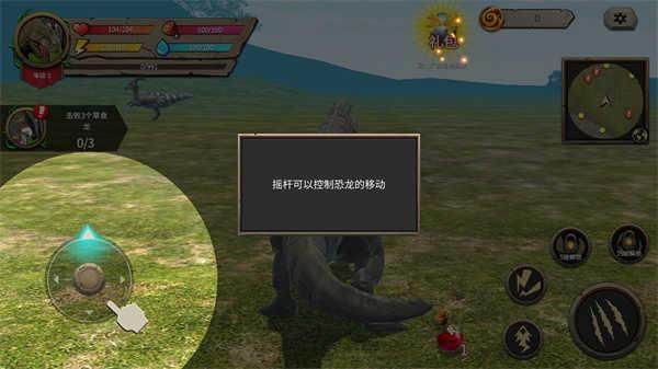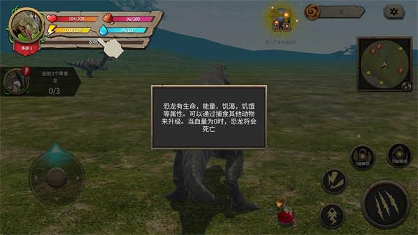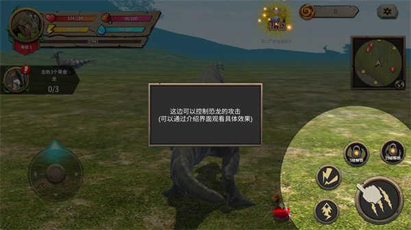 在游戏闯关的过程中玩家需要通过屏幕上显示的:摇杆可以控制恐龙的移动,右边可以控制恐龙的攻击(可以通过介绍界面观看具体效果)恐龙有生命,能量,饥渴,饥饿等属性。可以通过捕食其他动物来升级。当血量为0时,恐龙将会死亡,拖动屏幕可以调整镜头的移动和缩放,并且能在设置界面中选择自由视角或锁定视角。