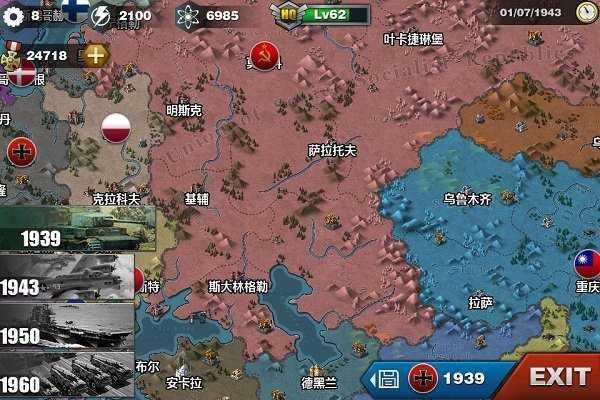 2.征服模式历经选择全世界任意一个国家,调整外交策略,对盟国实施援助,向其他国家宣战根据战场形式调整自己的战略目标,建设城市,发展科技,制造军事单位用最少的时间夺取最多的领土将获得高分,