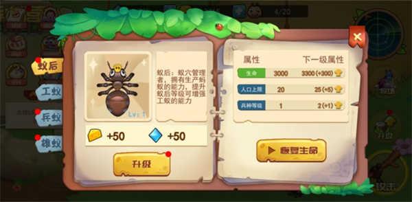 5、当有足够的钻石和奶酪时,就可以进行蚁后的升级了,当然还有兵蚁、工蚁等等;