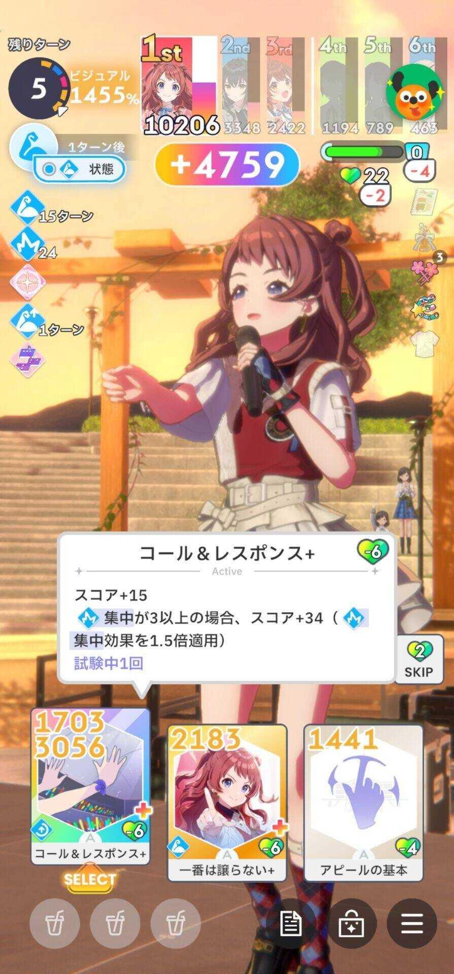 体力为0或者手牌极烂的情况可以选择右下方的skip空过这一回合,并且能帮助你手动恢复2点体力(这喘气有点亏本,感觉不如0费4元气。但人总是会折中的,如果10好调手上还有3张4费回心情的足取,并且左上方转盘是从没点过的属性,那偶尔喘口气也不是什么坏事(狗头))