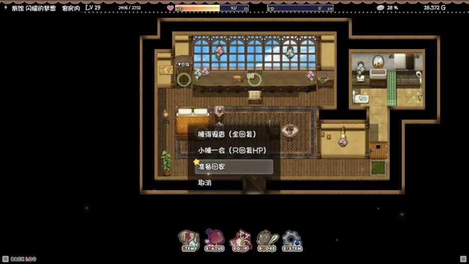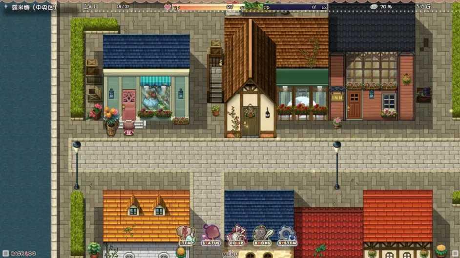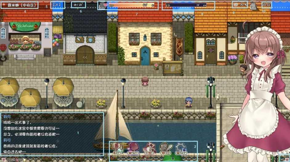 简单讲一下游戏主界面,左下角的[1]区域是日志记录,可以在选项里关闭,下方[2]区域的五个是物品、状态、装备、图鉴、系统界面,可以按键盘的X键关闭或者呼出。([1.2]区域的功能和界面都可以按快捷键快速打开,快捷键对应它们单词上标红的那个字母,例如你想打开装备栏,则按下EQ[U]IP的[U]键位即可。此外,还有一个快捷选择地下城的[P]键)。右下角的[3]是立绘开关,打开状态下可以看到莉可的形象,反之亦然(在迷宫里建议关了,防止有怪物突然偷袭被立绘挡住看不到)。左上角的[4]代表当前所处位置,[5]代表莉可的当前等级,[6]左边的数字代表当前的经验值,右边的数字代表升级所需的经验值,经验值可以通过击杀迷宫里的怪物获得,如图中所示是18/25,代表还需要7点经验值才能升级,升级后会自动把血量补满。[7]代表莉可的HP,HP归零战斗失败。[8]代表莉可的EP(EcstasyPoint),好孩子尽量不要让它变满。[9]代表当前饱腹度,与RougeLike游戏不同的是,这个游戏的饱腹度没什么实际意义,如果归零只会把你强制踢出迷宫,别的没有影响。[10]代表当前所持金币,金币通过击杀迷宫里像小猫或史莱姆一样的黄色怪物可以大量获得,金币主要可以在服装店买衣服。