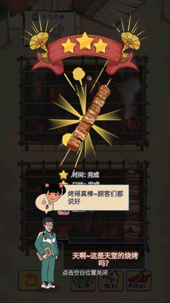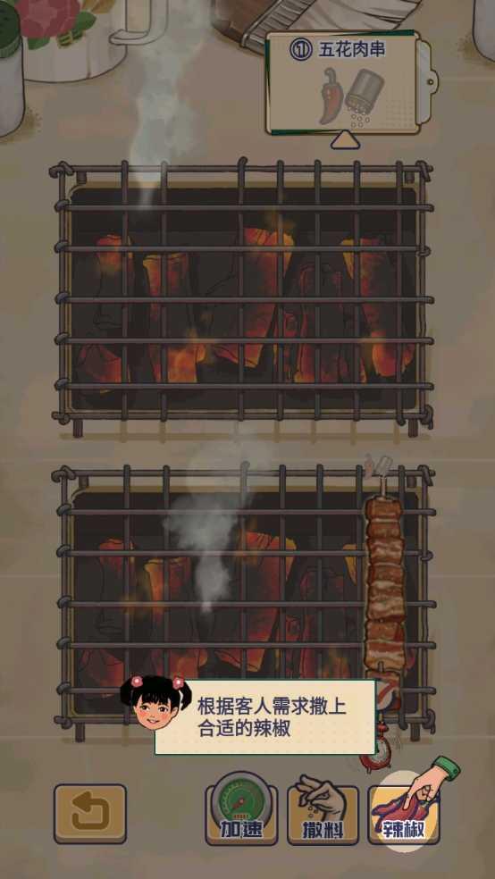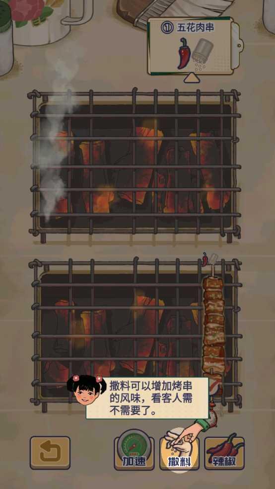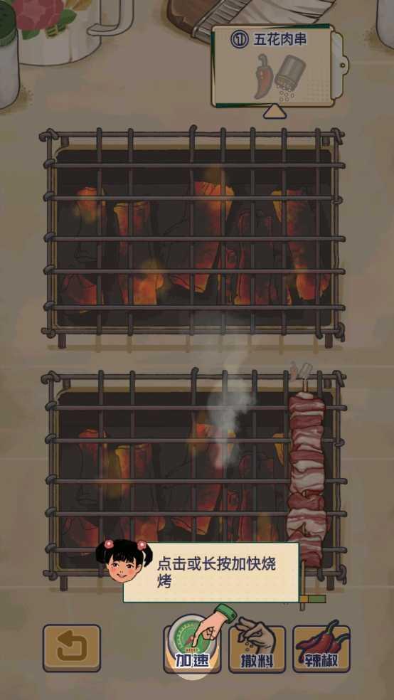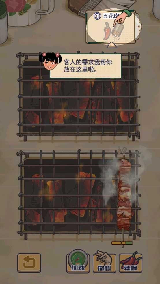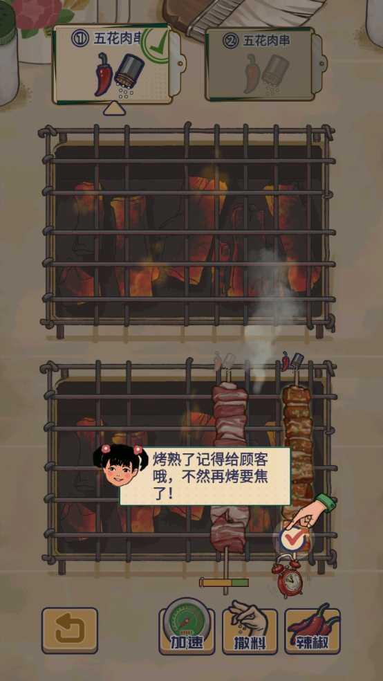 2、点击加速按钮可以提升烤串的速度,帮助玩家提升经营效率;