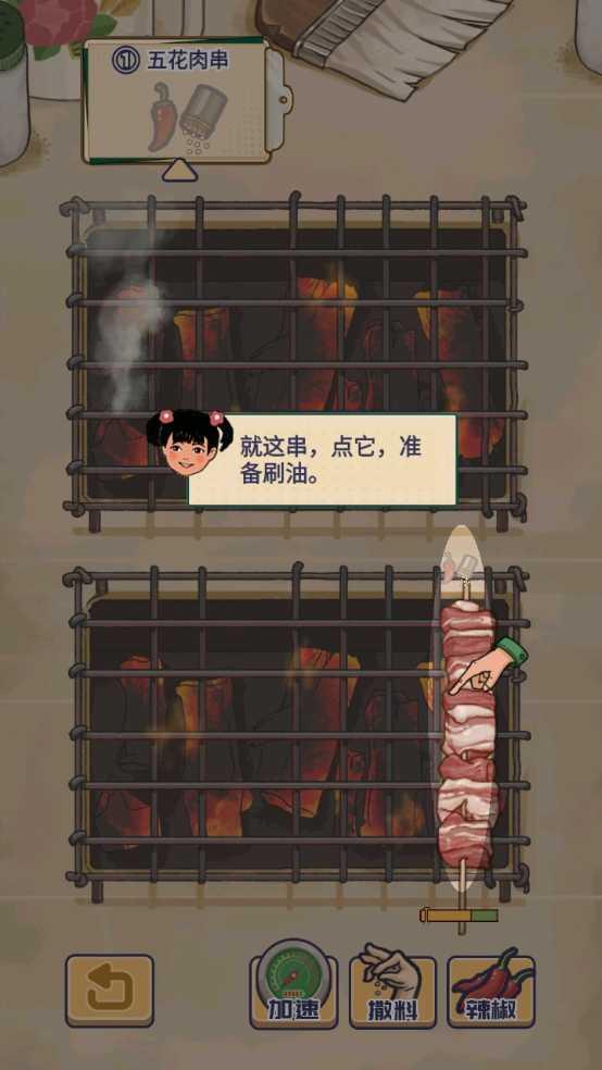 3、之后就可以制作美味烤串啦,玩家需要根据烤串下方进度条,合理调整速度,添加调料。
