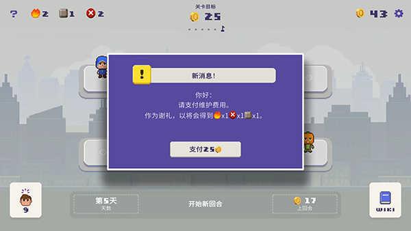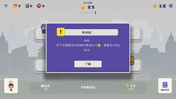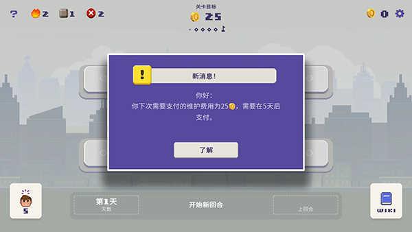 2、游戏中是以天数为进度的,消息提示我们需要在5天后支付25金币的维护费用,点击【了解】即可继续,