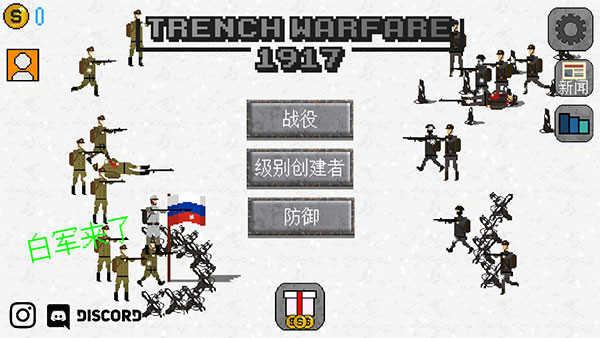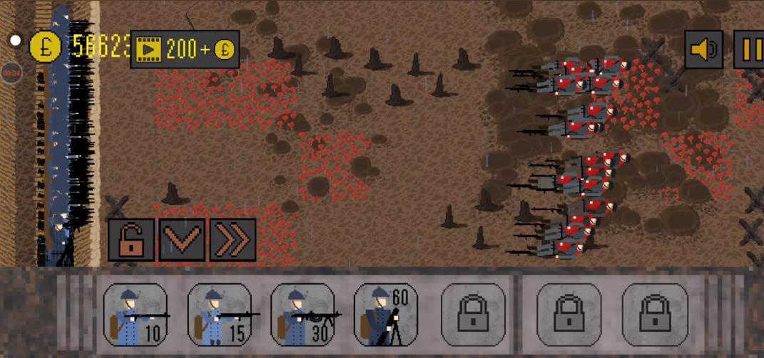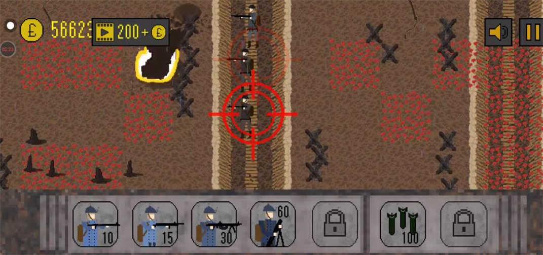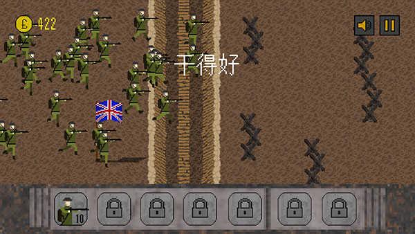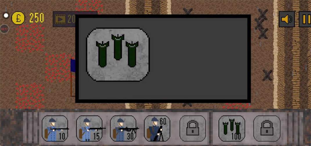 控制士兵:使用鼠标控制,点击左下角的士兵图标来召募士兵,这些士兵会跳到战壕里阻击敌军。