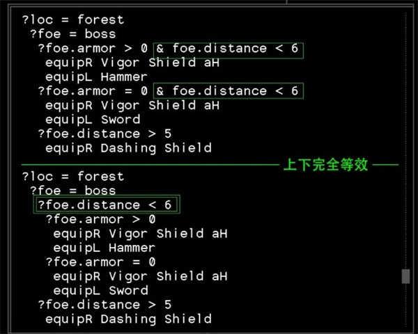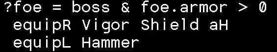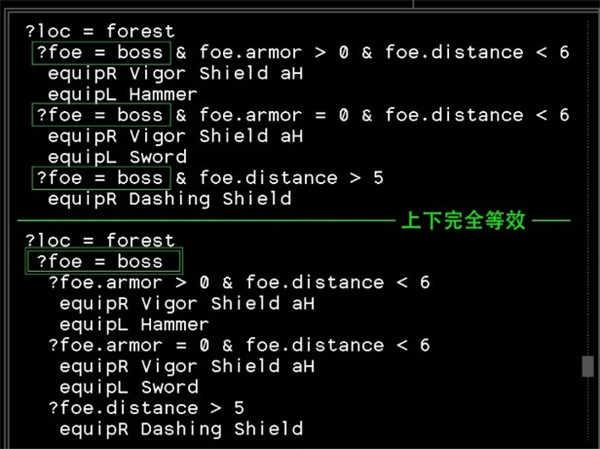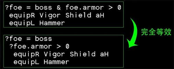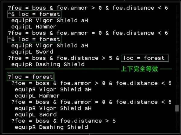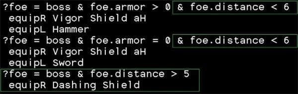 上图的这段表示,当目标为boss,且目标护甲大于0时,右手装备盾,左手装备锤子。