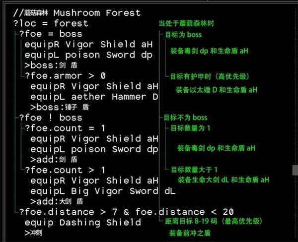 这样,当目标为boss,且目标护甲等于0时,右手装备盾,左手装备剑。