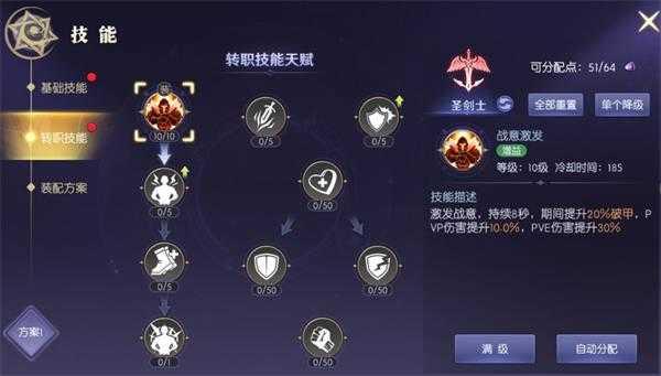 将身上所有的装备全部提升到指定的星级和品阶之后就能够点击前往转职完成任务之后最重要的就是选择转职的方向,小编这里以战士的转职为例来进行介绍,战士在转职后有两个方向分别是侧重输出和爆发的圣剑士,以及侧重肉盾和生存方向的守护者。之后技能和天赋也将发生变化,圣剑士能够获得专属技能,战意激发,激活之后在持续时间内提高破甲属性以及PVP和PVE伤害,而守护者的专属技能圣盾护佑,能够召唤出护盾保护自己,提高格挡值和防御属性。
