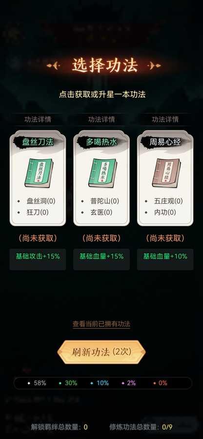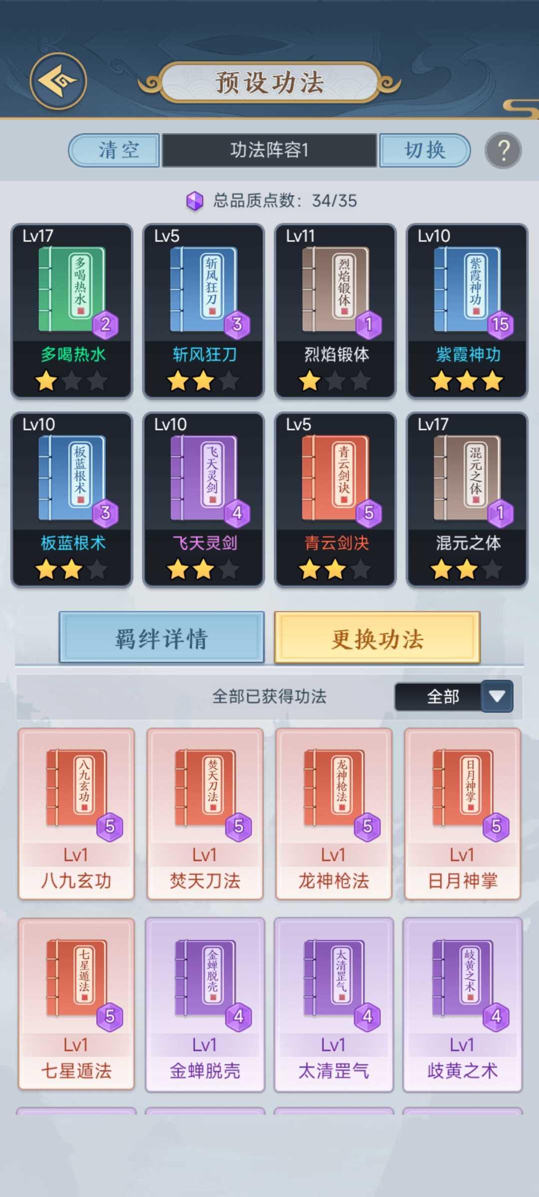 龙神枪法1星+勾魂掌法2星+万法之门2星+黄庭心经2星+紫霞神功2星+风雷法阵3星+多喝热水3星+乾坤阵法3星+观天心法2星