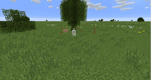 在树下自然生成的白色与黑色的羊,其旁边也生成了一只猪