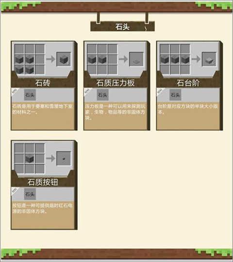 打掉他可以获得圆石,圆石可是非常重要的哦~只有有圆石你才可以做石稿,有石稿才可以挖铁,有铁才可以挖钻石,可以通过精准采集挖石头获得,如果没有精准采集他会掉圆石。把圆石通过熔炉烧也可以获得,在合成框铺满2x2的空间可以获得石砖,是很好的建筑材料。