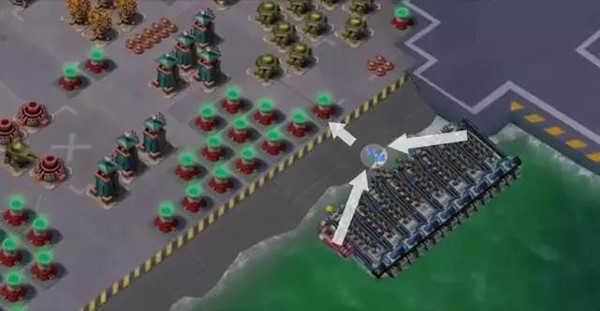 缺点:布局的靠前也意味着基地位置的靠前,敌军能尽快的攻击基地。敌军往往选择一侧登陆来避开另一侧的防守武器。