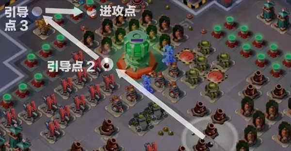 2、火箭发射器、震爆火箭炮、迫击炮是对人海流威胁较大的群伤防御武器,所以进攻思路就是将这些群伤防御武器先拆掉,但是目标这么多,怎么快速拆完呢,进攻顺序很重要。