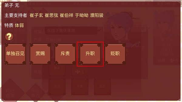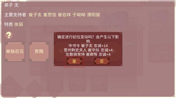 18、确定进行妃位变动吗?会产生以下影响中书令崔子玄忠诚+14乐苍州刺史夫人崔华似忠诚+4 g左散骑常侍崔卿恽忠诚+4,点击是;