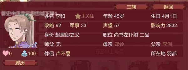 然而并不是100忠诚就代表着能重用,得对臣子的三族、支持者、以及政略做一个大致的评定。