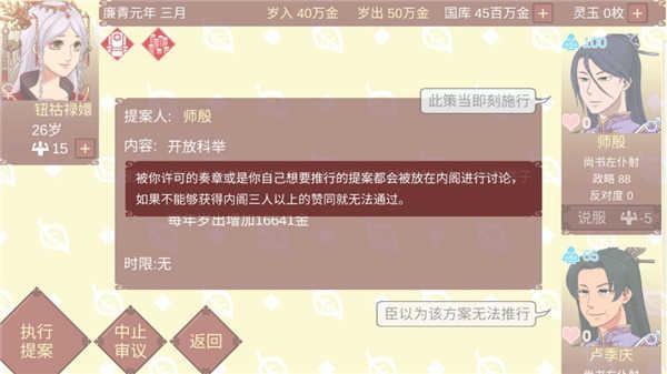 10、被你许可的奏章或是你自己想要推行的提案都会被放在内阁进行讨论,如果不能够获得内阁三人以上的赞同就无法通过。