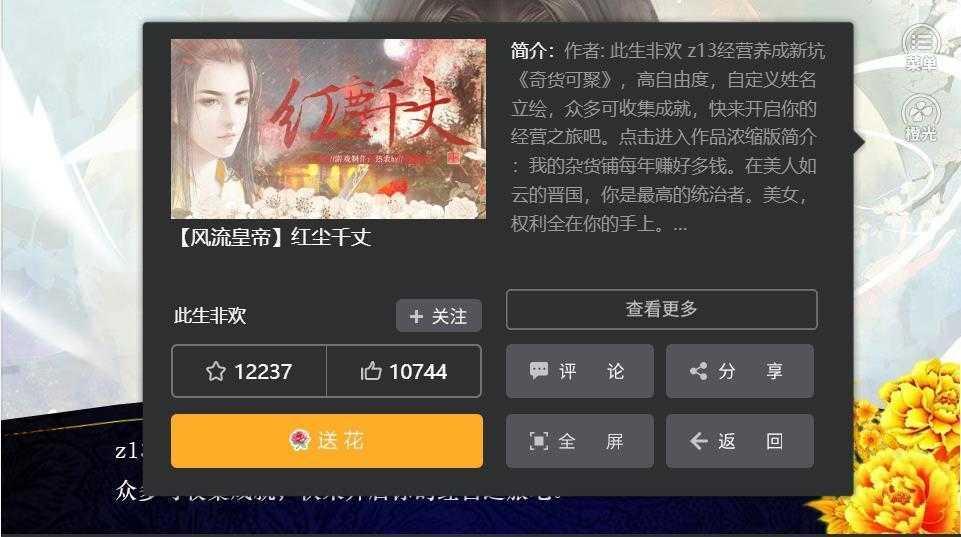 红尘千丈这是一款由橙光出品的男性向RPG手游,在红尘千丈的游戏中玩家开局是一个皇帝,不仅拥有万里河山同时还拥有着后宫佳丽,玩家选择不一样的剧情将会有不一样的游戏结局,喜欢的玩家可以试试红尘千丈哦!