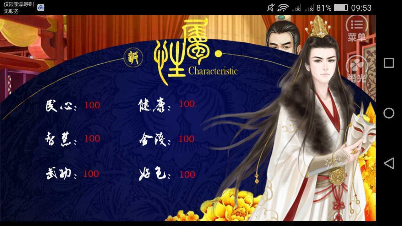 在美人如云的晋国,你是最高的统治者。美女,权利全在你的手上。面对各种各样的美人你该如何抉择呢?翻牌子,艳遇,民间走访,异国结亲,美人无处不在!而在你国泰民安的统治下,野心勃勃的各位王爷正在预谋着谋反……在你深宫中温文尔雅的嫔妃又会有什幺样的举动呢?一见倾心的明月竟是一个舞女,你会愿得一心人还是坐拥佳丽叁千?