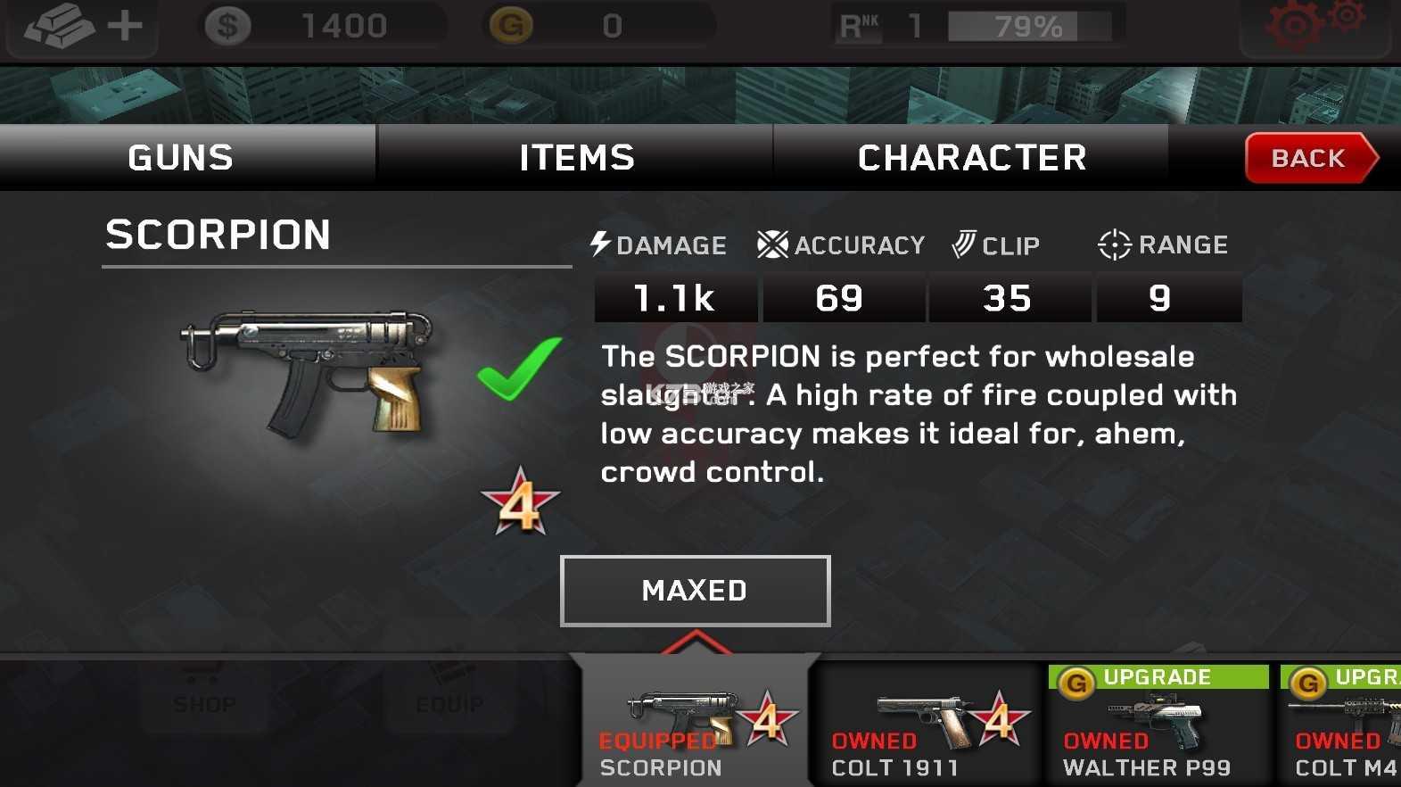初期不错的选择,各种参数上都优于COLT 1911,三级攻击力370,精准度91,弹匣14,射程12。