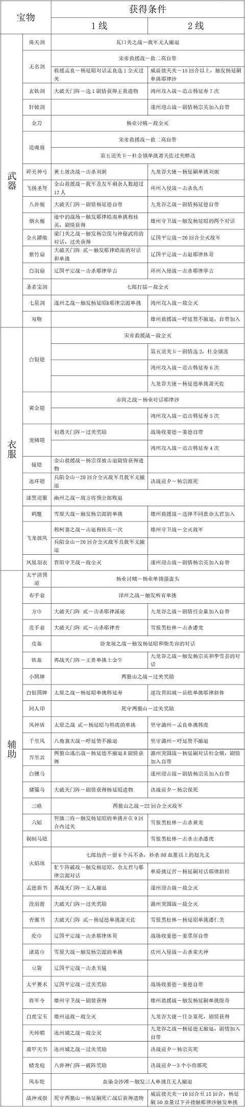 剧情模式中获得宝物的简要条件,对比一线与二线的难度可自行选择攻略路线。