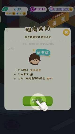 房东模拟器游戏整体的操作十分简单,采用了模拟经营游戏一贯的放置点击玩法,你只需通过宣传自己的房屋,以此来博得租客的喜爱便可以,在这过程中,你会结识各种各样的租客,有才华横溢的作家,有放荡不羁的歌手,甚至有温文尔雅的画家等租客,都将为你带来与众不同的游戏体验。