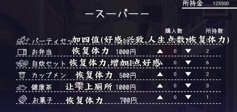 其实就是第一本书少买,因为阅历这个东西有很多办法拿的,要玩h解结局b就多买第二本书,前期要点散步,完了就工作,吃饭喂自制,尽量把体量磨完去买后面三本书,到中期基本不缺钱就多买大餐(那个七百的是薯片能加好感,一天一次,建议整),中期在女主愿意和你散步之后再拉体力,后期就没啥好说的,阅历满了你爱咋玩咋玩