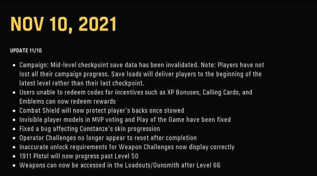此次更新去掉了游戏关卡中间的检查保存点。虽然玩家不会失去所有的战役进程,但读取点将从他们最后所玩关卡的起始点开始。此外还允许玩家在66级后使用Loadouts/Gunsmith中的武器。Operator挑战完成后,不会再出现重置。