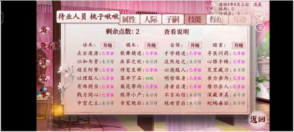 音律,舞技,才学,刺绣。音律舞技决定你表演才艺,侍寝选项加的兴致。才学决定皇帝太后有时会让你写字画画,有珍宝送,貌似还跟孩子的什么属性相关我不记得了。刺绣可以卖钱