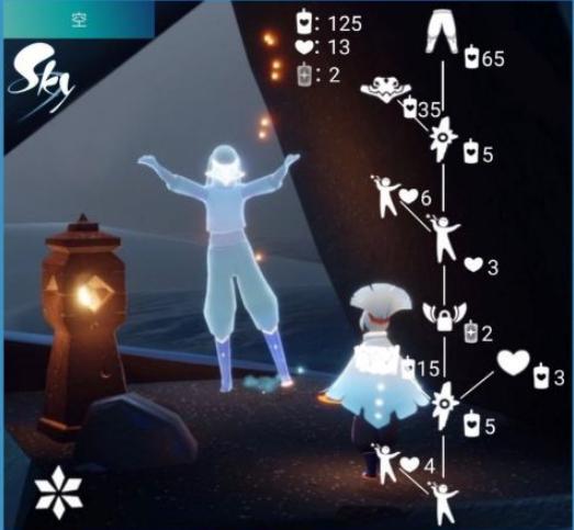 找到石碑前的人影可以打开先祖商店。在先祖商店中我们可以用蜡烛解锁姿势或祝福,用爱心购买新的装扮,还可以购买乐器与好友合奏。