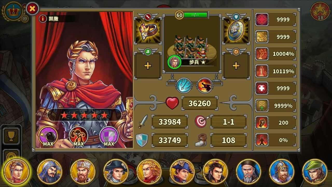 先说选将,将领是三技能,第一为主动,目前看有三大类:第一类为多重攻击可以攻击多人,炮兵基本是一炸一片,骑兵步兵都是打一直线,弓兵为多目标;第二类为恢复类,目前入手贞德实测一级的话基本就是几十的血根本没用;第三类为buff,个人觉得可以放弃。第二技能一般为攻击附加少数几个是降某种兵种的伤害,目前见到的有混乱、降士气、降攻击、降防御,还有两个nb技能,一个是勇猛升到最后可以让对方无法反击,还有一个bug技能后勤,满级后100%杀人回血12%,如果有个华盛顿扔到人堆里就是开了无双的状态,光靠反击就能清空一片,而且即使是一级在征服里触发概率也超高目前打前两个时代能保障霍去病和李世民的血量。