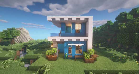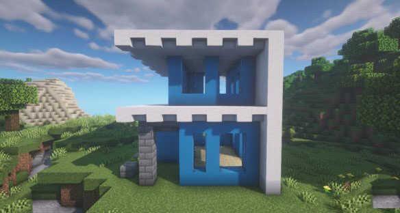 将右侧四个淡蓝色混凝土换成玻璃板,增加一个白色混凝土,外面用丛林树叶和石砖围一圈,在白色混凝土上方放置5格高的竖纹石英块块。在淡蓝色混凝土上叠加四格淡蓝色混凝土,搭建出墙面。