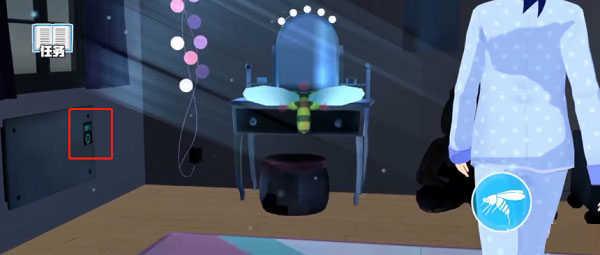 2、当我们完成其他的三个任务时,等待小姐姐再次入睡,来到房间右侧窗户的右下角靠梳妆台的窗户处,找到空调的开关;