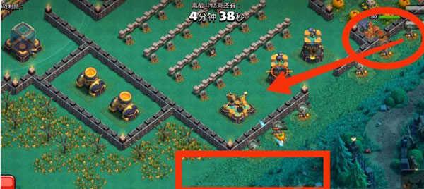5、女王在拆炸弹塔的时候,就在下面的红色方框内下南瓜头野蛮人,10个左右就够,吸引x弩仇恨。这样可以进一步保证女王和女武神的状态良好。
