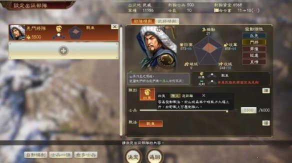 石兵八阵:军事设施,费用1500金,耐久300,能够令1格范围内敌方部队陷入混乱状态,同时降低士气。只能由拥有“石兵”个性的武将进行建造。