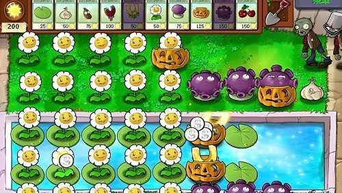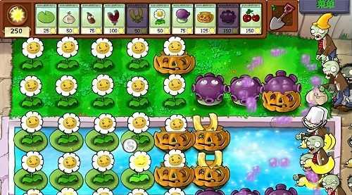 2.开局阵容,如下图。留两百个阳光,以免蒜头或者南瓜头被吃掉。