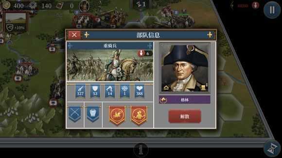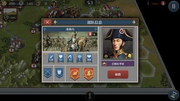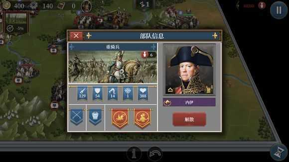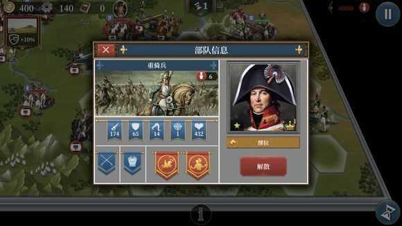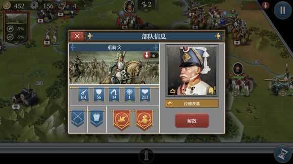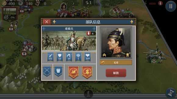 需要注意的一点是,军力有轻步兵、掷弹兵、轻骑兵、民兵等,在移动时尽量多查看兵种信息,移动到同等军力或比自己弱的敌人附近,增强攻击、降低伤害。