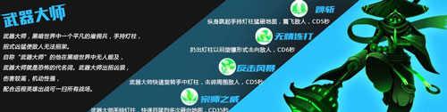 6、武器大师:单从小编体验的感觉来说,武器大师的技能可以说是简单又粗暴,Q技能的作为范围性伤害技能来说,他CD只有4秒是最大的特点,再加上其击飞的属性,让这个技能作为先手技能来说非常适合。W技能是远程技能,作为击飞较远的怪物可以使用这个技能来作为收尾,E技能没有太多可以说的,然而要说的是R技能的6次捶地板,最后一次的攻击是前面攻击的2倍,作为击杀BOSS来说非常适合。