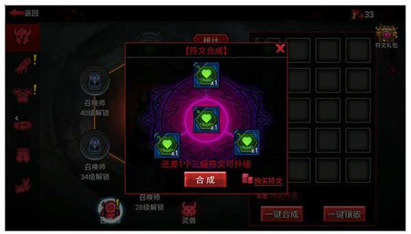 符文系统是灵活多变的,前期资源不够的时候可以先上点低等级符文带着,千万别把符文槽空着,这样很亏,后面慢慢符文多了后就可以取下来合成更高级的,三个同样等级同属性的符文可以免费合成更高一级的符文,合成不需要手续费且百分百成功率!