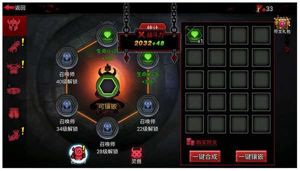的符文系统将于通关第二章第六关后解锁开启,这个时候人物等级16级一定要去把符文搞起来才能保证后面通关的顺畅!当第一次开启符文系统时,6大装备部件均已开通第一个符文插槽分别对应生命、攻击、防御、破防、暴击、抗暴6大种类符文,每件装备中间可镶嵌特殊属性符文!(PS:人物每升级一级开启一个符文插槽)