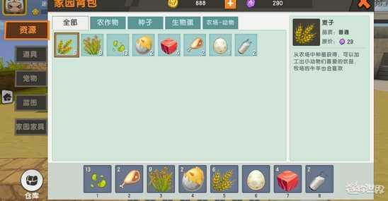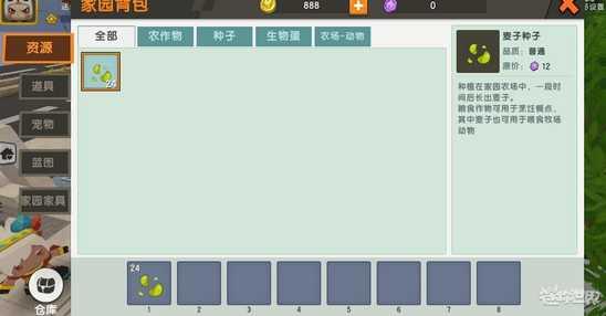 我们首先购买免费的麦子种子,麦子种子就会存入到家园背包中,点击背包按钮或电脑端B键,即可打开家园背包,可以看到我们刚刚购买的麦子种子: