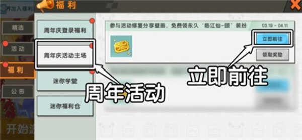 1、点击福利,找到周年庆活动主场,点击前往按钮即可前往活动页面。