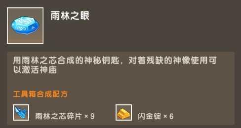 使用雨林之芯碎片和闪金锭,可以合成关键道具:雨林之眼,它是开启神庙挑战羽蛇神的关键钥匙!