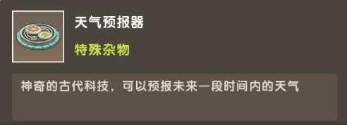 天气预报器是神奇的古代科技,出现在神庙最顶端的房间内,用石镐可以采集下来,摆放后可以通过上面的图案准确预测未来的天气。