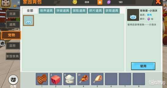 制作的料理可以用在宠物探险玩法当中,家园宠物也是本次更新推出的全新玩法,我们查看背包,会发现系统会赠送我们一个宠物。