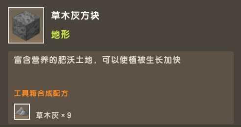 草木灰方块富含丰富的营养,种植在草木灰方块上的作物,相比种植在土块上生长会更迅速哦~