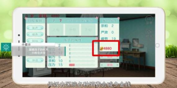 做的每件事都会影响孩子的属性,要做正确的事,做饭、去医院各种消费会减少金钱,记得去银行取钱,退出游戏记得存档。