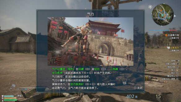 4、气力和回避系统:游戏中的绿色计量条就是气力,这个系统和“怪物猎人”、“黑暗之魂”等系列相似,人物进行加速奔跑、回避和轻功时都会消耗。在骑乘状态下加速奔跑和冲撞敌人也会消耗气力槽,气力槽消耗完后马匹会有抬起前脚的硬直动作,所以建议气力条尽量不要消耗完。